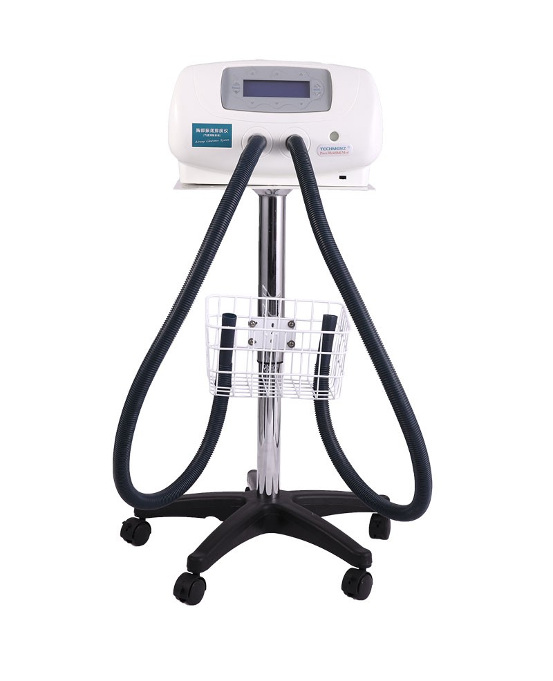 背心式排痰机作用原理: 通过模拟正常生理咳嗽的原理,将患者所穿专用充气背心用导气软管连接到高速脉冲泵上,并快速地充气和放气,使患者胸壁发生有规律的舒张运动,患者气道和肺部发生自主的震颤气流和定向引流力,促使呼吸道粘液及各个肺叶深部代谢物松弛,液化、脱落;并在定向引流力的作用下将已液化脱落的代谢物按照选择的方向(如细支气管→支气管→气管)排出体外。