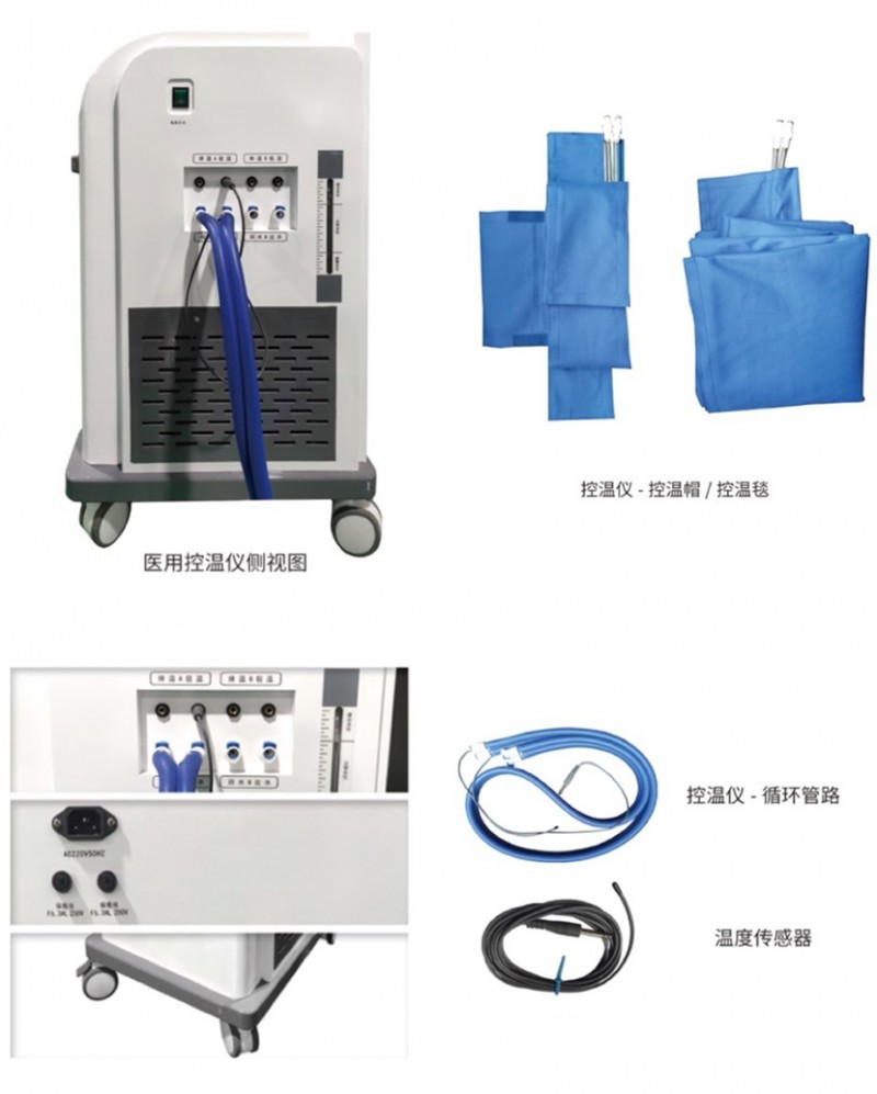 工作原理:医用控温仪是利用制冷、制热原理,在主机供水口与回水口处,接上内有循环管路的毯子,系统通过半导体、风扇、水泵进行实时控制,实现毯子的循环水制冷/制热的温度控制,循环水与患者发生热量交换,达到控制体温的目的。
